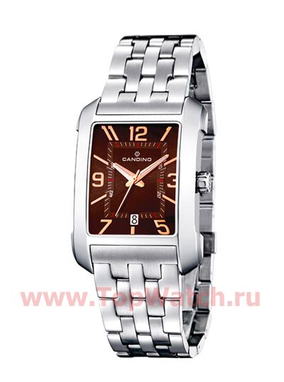 имеет корпус прямоугольной формы выполненный из нержавеющей стали, с циферблатом коричневого цвета