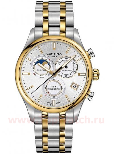 А дополнительные фунции: Антибликовое покрытие стекла, безель и часть звеньев браслета - PVD-покрытие цвета желтого золота. Функция Precidrive EOL Хронограф, дата, фазы Луны, EOL (индикатор разряда батарейки) придают удобство.